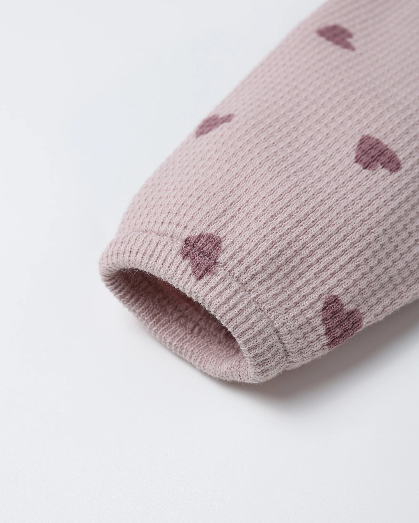 This cozy waffle knit raglan jumpsuit features coconut buttons down the chest and elastic at the wrists and ankles for a comfy fit.