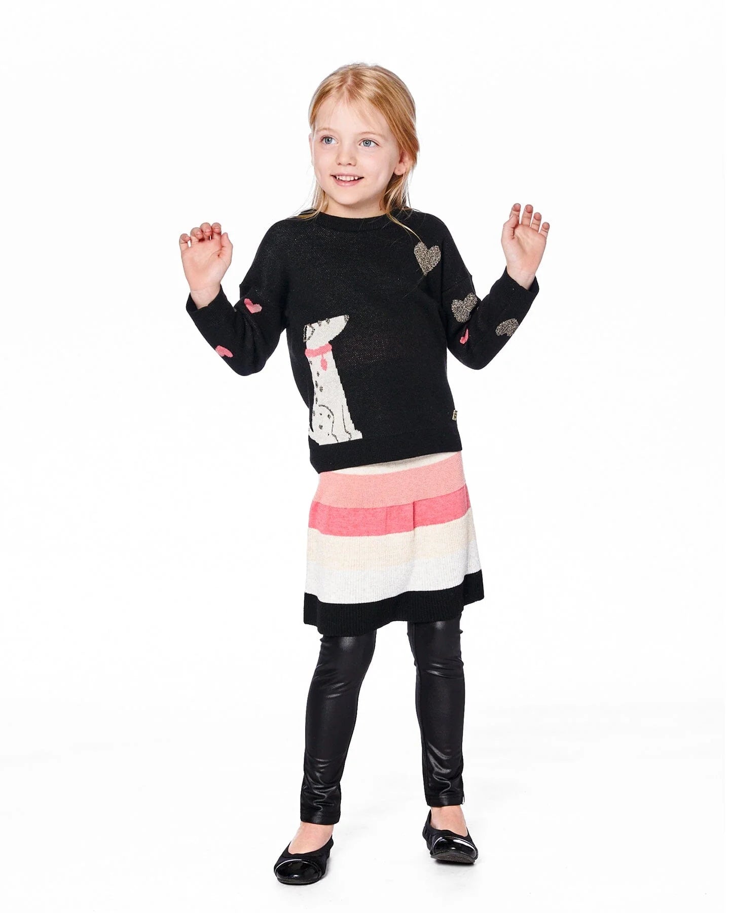 Full of charm and softness, the Knit Sweater Black With Dalmatian And Hearts adds a playful touch to every young girl’s outfit. This pullover showcases a jacquard dalmatian on the front, surrounded by glittery gold and pink hearts on the sleeves and body. Knitted in a cozy wool blend with ribbed trims, a round neckline and a relaxed fit, it’s made to keep her warm and stylish through crisp fall walks and chilly classroom days.