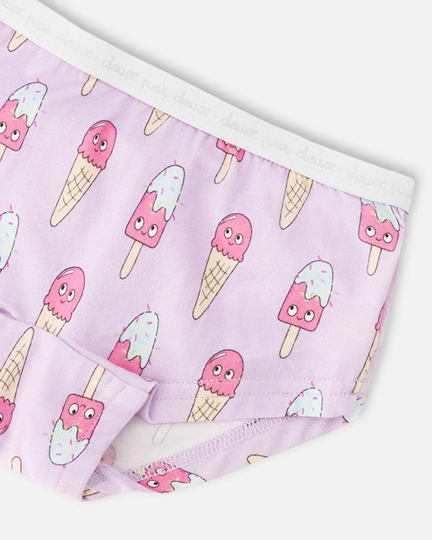 This pack of three boyshort panties brings together fun prints and everyday comfort. One panty features a playful lilac ice cream pattern, another is covered in cheerful kittens on a green background, and the third shows delicate blossoms on a pale pink base. Made with soft organic cotton and a touch of stretch, this set is designed to move with her all day long.