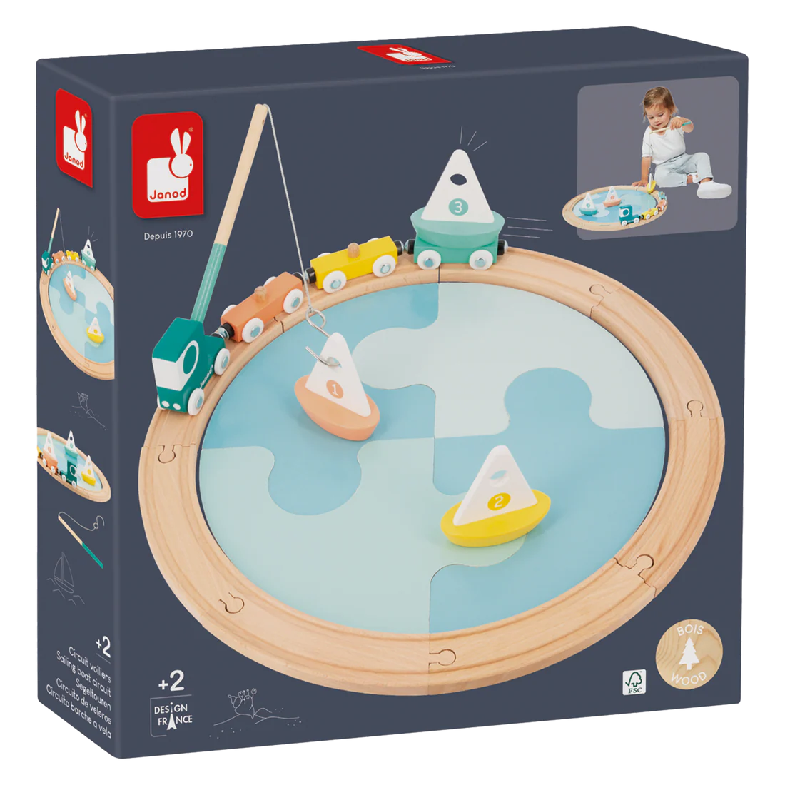 Let's go for the launching of the boats!! This super truck equipped with 3 magnetic cars transports 3 sailboats ready to go to sea. Thanks to the fishing rod, your child will be able to retrieve the boats to put them in the water, like a gue. The sea is easy to put together thanks to its 4 large cardboard puzzle pieces. The wooden circuit made up of 8 pieces is grafted all around to circulate the truck. Clever! the fishing rod is stored in the back of the cabin when not in use. Develops the imagination and stimulates dexterity. Early learning toy in wood and cardboard FSCTM for children from 2 years old.