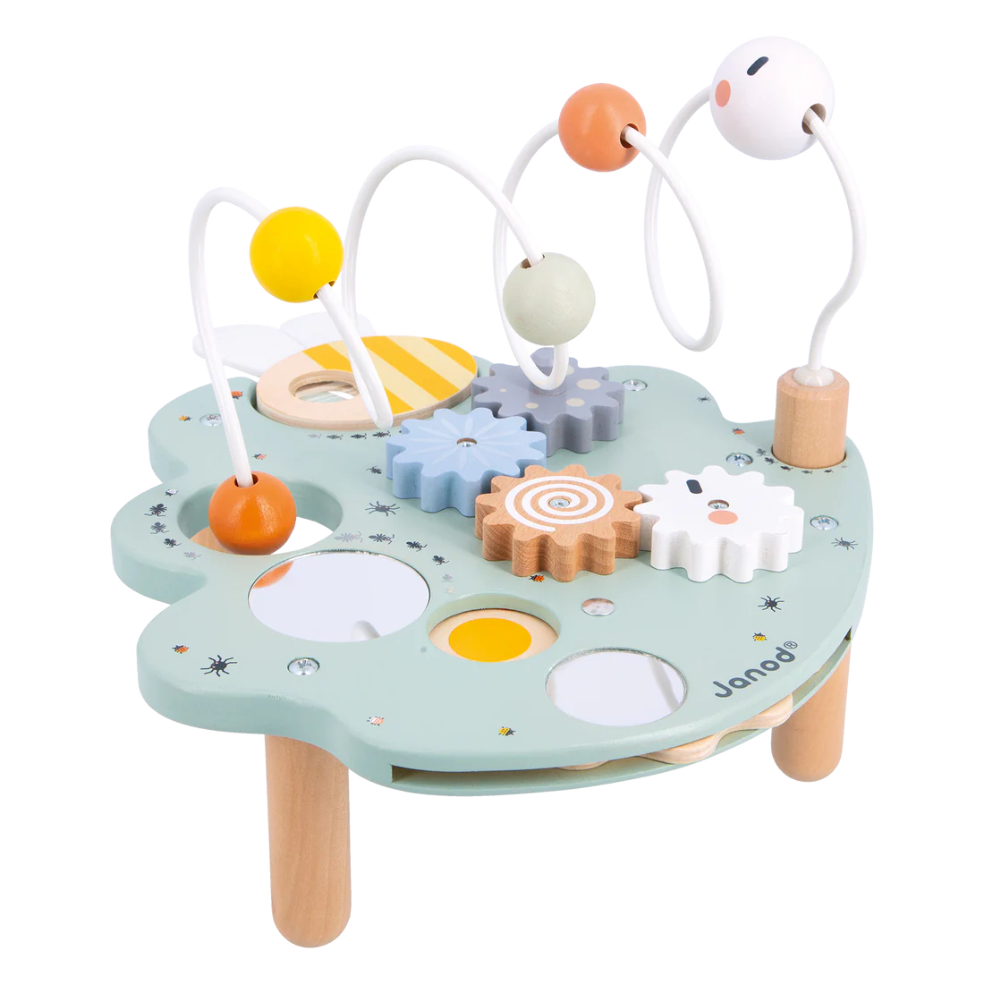 Give your baby a world of discoveries with this wooden activity leaf! Inspired by nature, it features 6 activities: a mirror, a fabric caterpillar to handle, a sliding ring, a ladybug to move, a spinning wheel, and a felt bee. This early learning toy promotes fine motor skills, sensory development, and hand-eye coordination. Its compact format makes it perfect for little hands and travel. Materials: wood (plywood and cherry wood), felt, and fabric. Water-based paint. Dimensions: 29.5 x 23 x 2 cm. Suitable from 18 months.