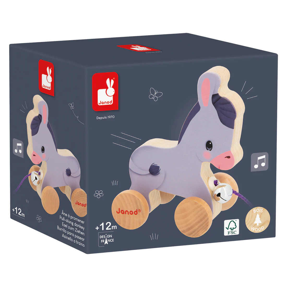 The Farm Pull-Along Donkey is a wooden toddler toy designed for children aged 12 months and up, supporting early walking with a fun and engaging companion. A ringing bell at the front irides with each step, stimulating hearing and curiosity. Its cute design and toddler-friendly size invite exploration and imaginative play. Crafted from wood sourced from sustainably managed forests and finished with water-based paint, this eco-responsible toy aligns with modern environmental values. The 50 cm pull-string and silent wheels ensure smooth, quiet play. Measuring 11 × 6 × 13.5 cm.