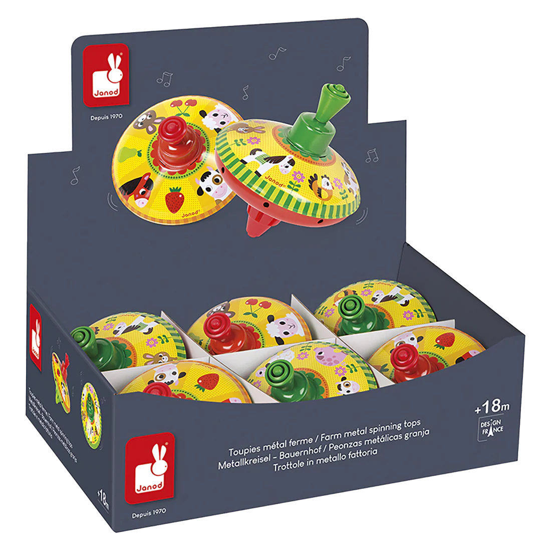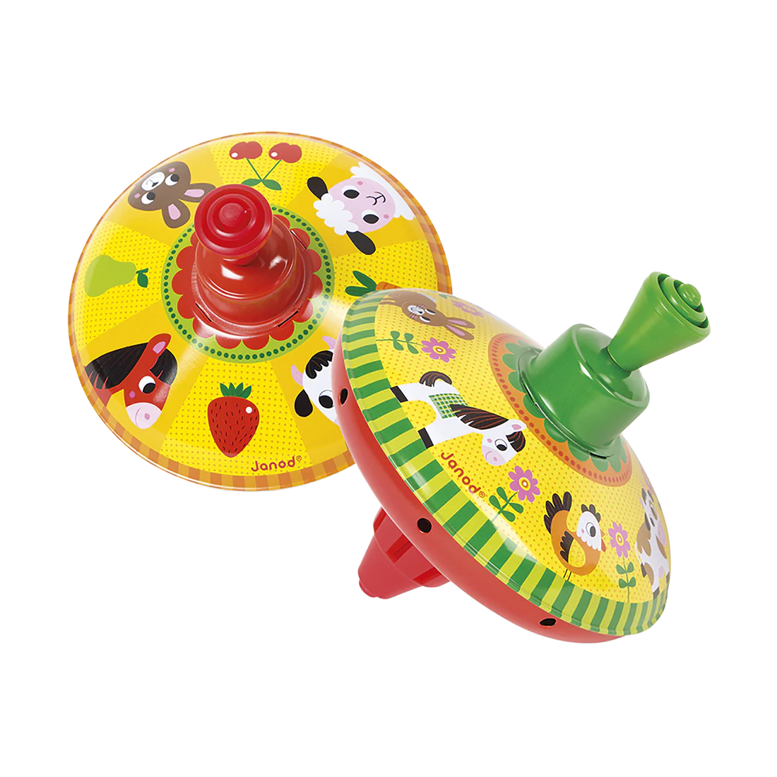 This very colorful spinning top will develop the dexterity of toddlers. As the spinning top spins, a slight buzzing noise is heard. Just push the lever down and the animals spin at top speed and the spinner stays balanced. Metal spinning top on the theme of farm animals. 2 assorted models. Plastic handle.