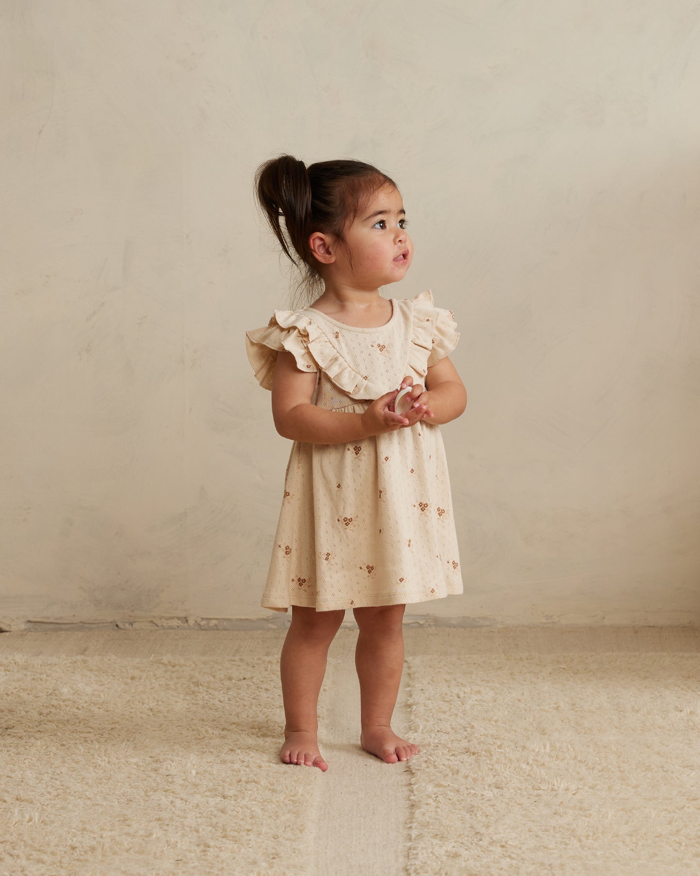 Flutter sleeve dress with sweet ruffle detail in our classic pointelle fabric. Button back closure for easy changing. All sizes include coordinating bloomers.