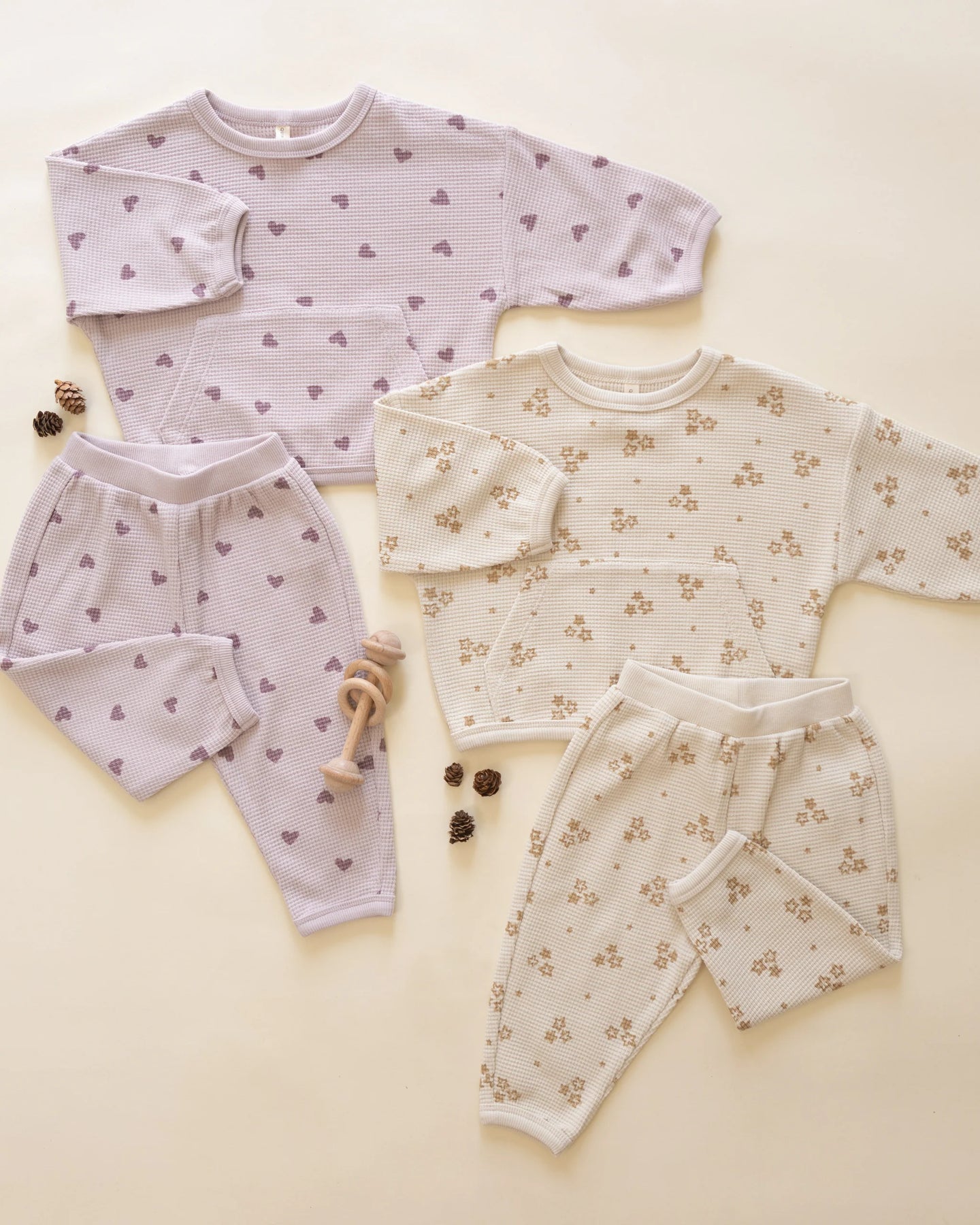 Our Waffle Slouch Set includes a long sleeve top with a large front pocket and matching pants—perfect for lounging and play.